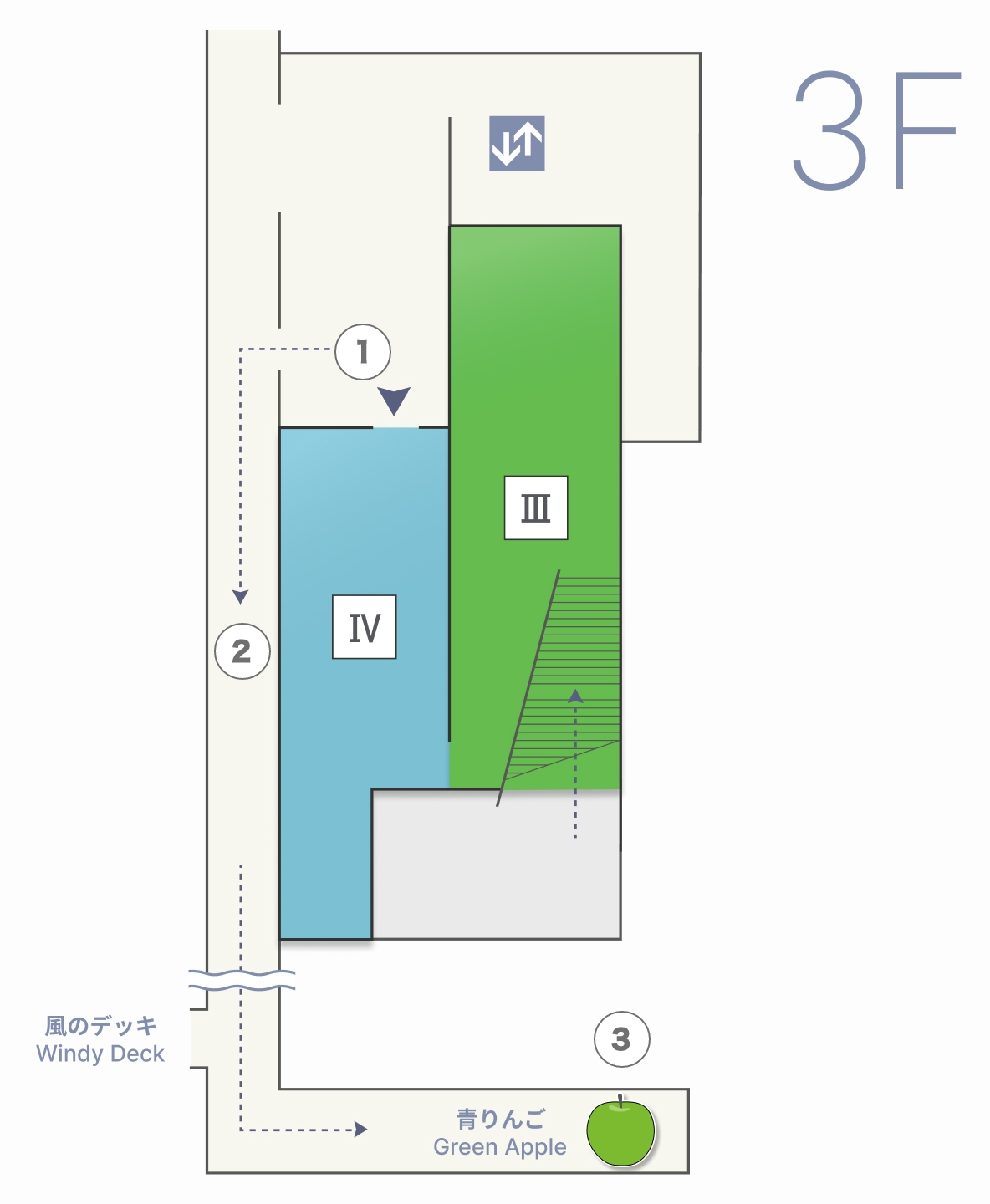 ③ 通路の先、左に見える海のデッキに「青りんご」があります。