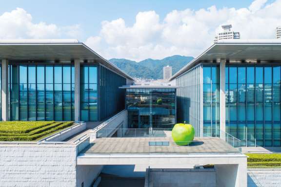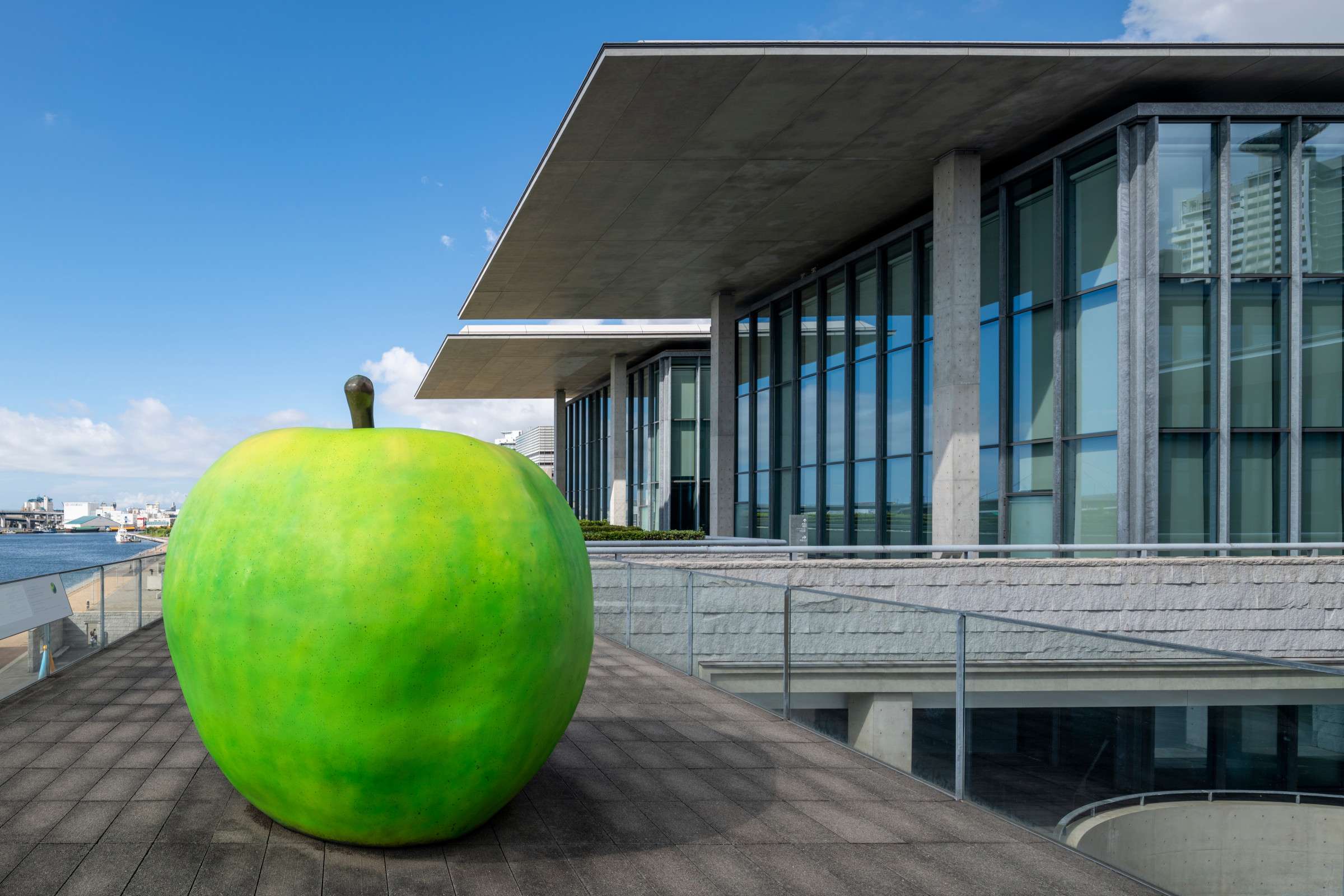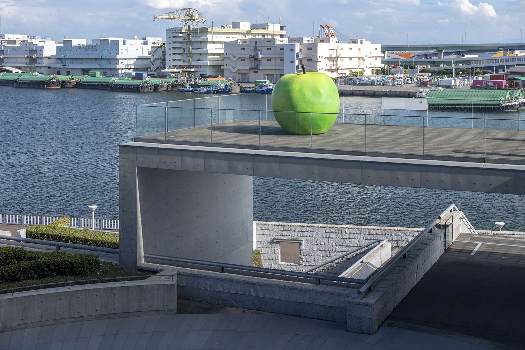当館の海のデッキにある「青りんご」のオブジェは、2019年に増築されたAndo Galleryとあわせて、安藤忠雄建築研究所より寄贈されました。アメリカの詩人、 サムエル・ウルマン(1840-1924)の詩『青春』に感銘を受けた安藤忠雄が、その美しく力強い詩句へのオマージュとして「人間も建築も、街も社会も、熟しきらず、挑戦心に溢れた青いままでありたい」という思いを込め制作し、海を臨むこの場所に設置されました。